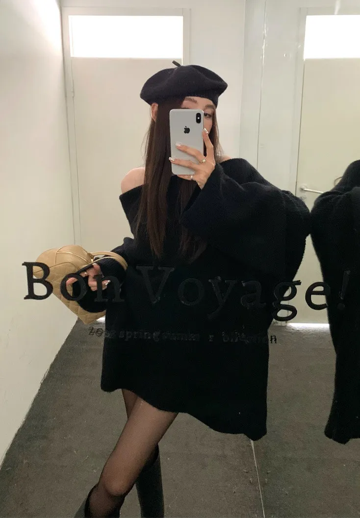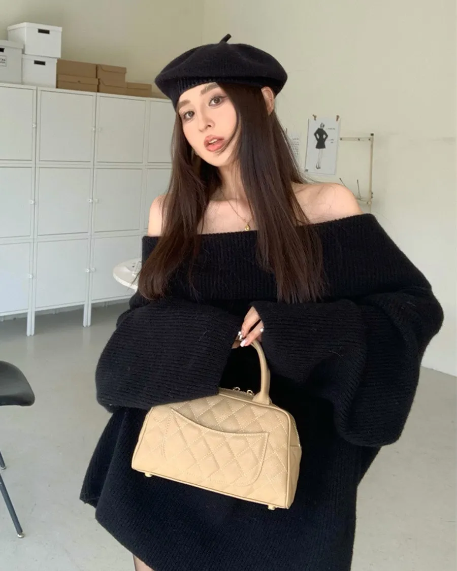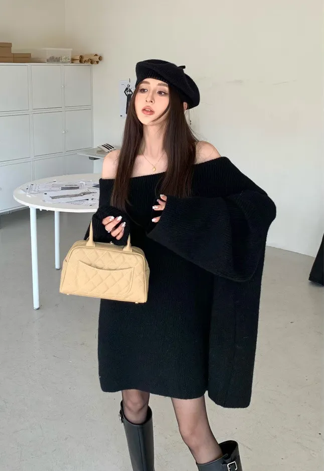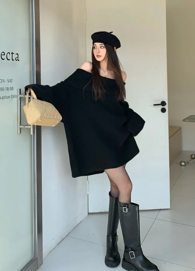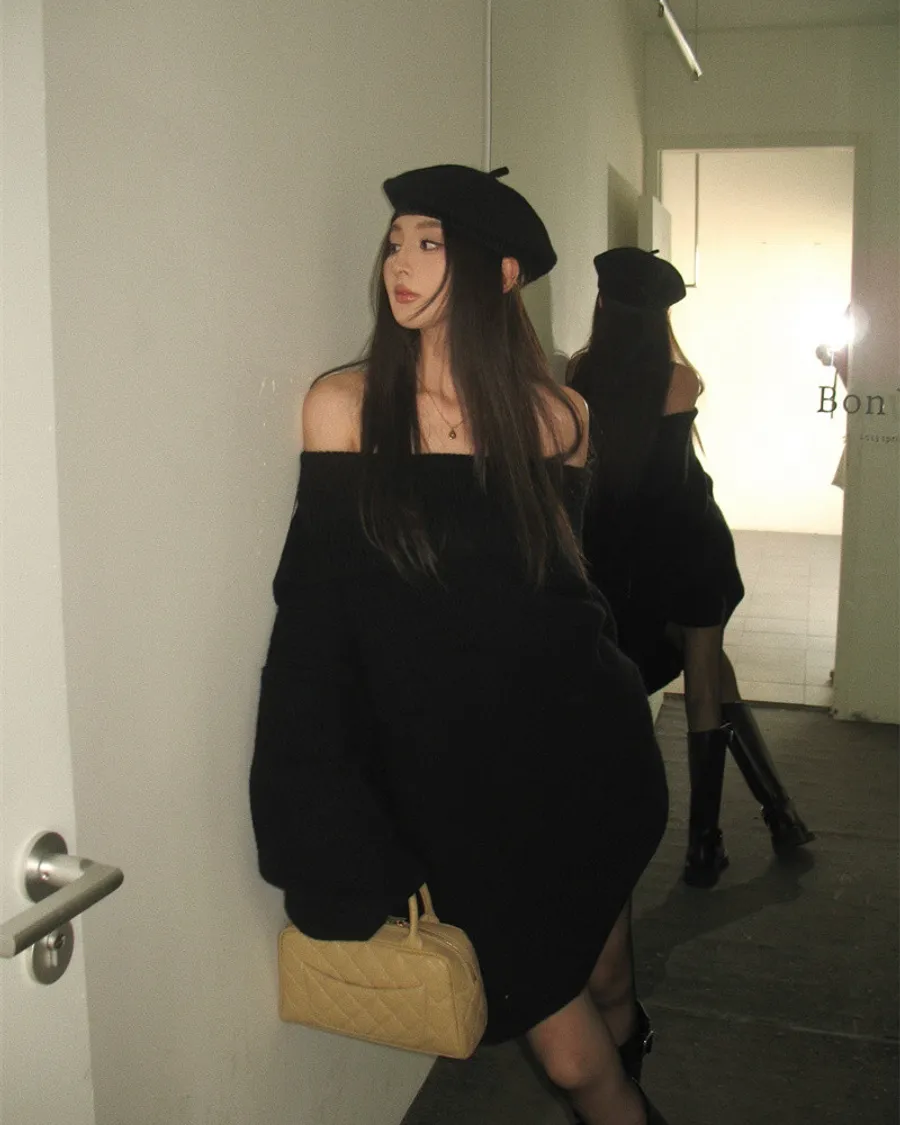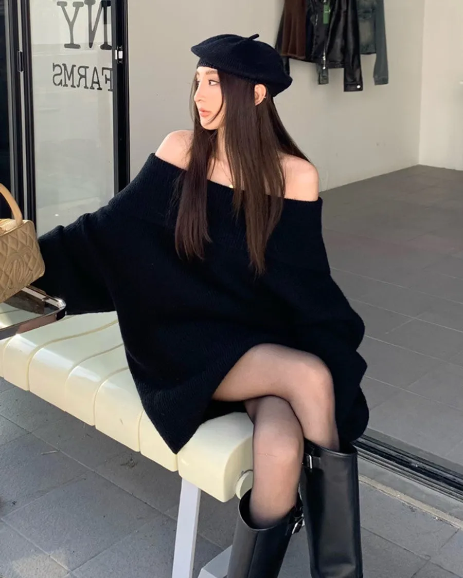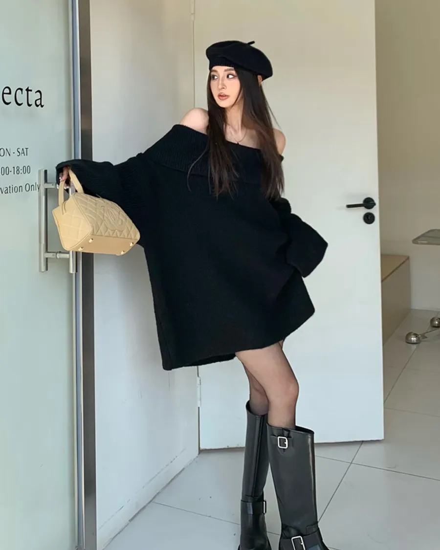 Basic Flat大翻領一字肩平口毛衣洋裝