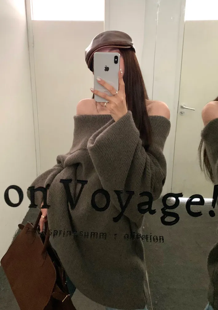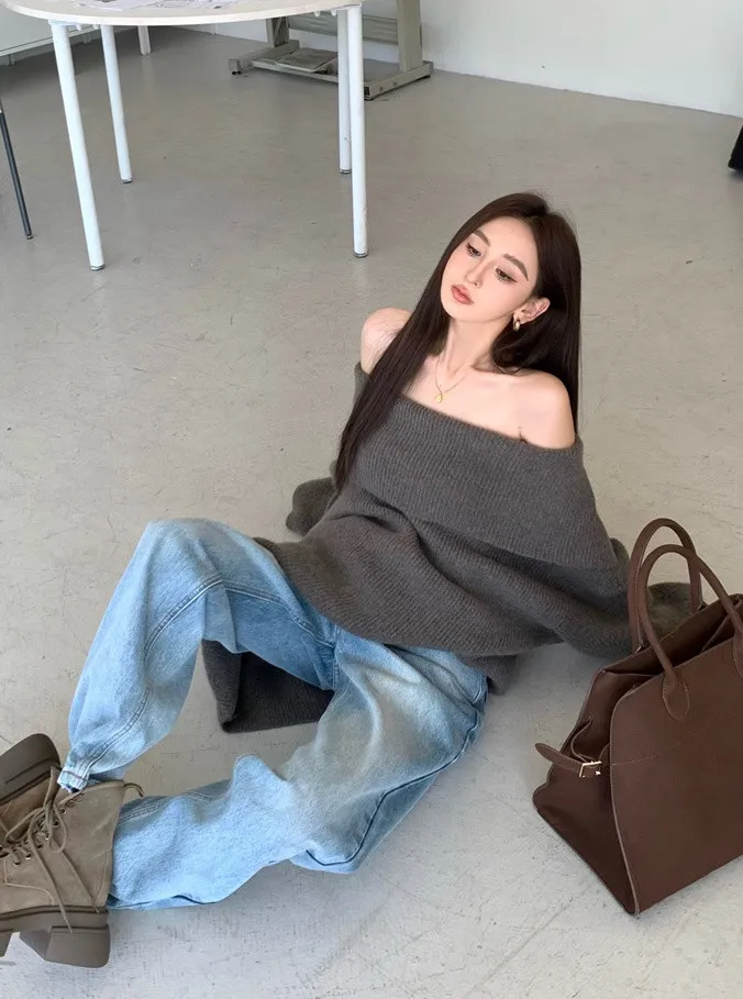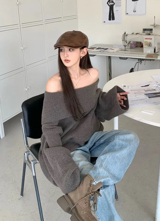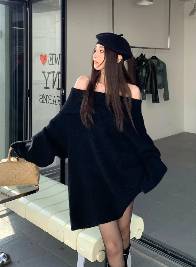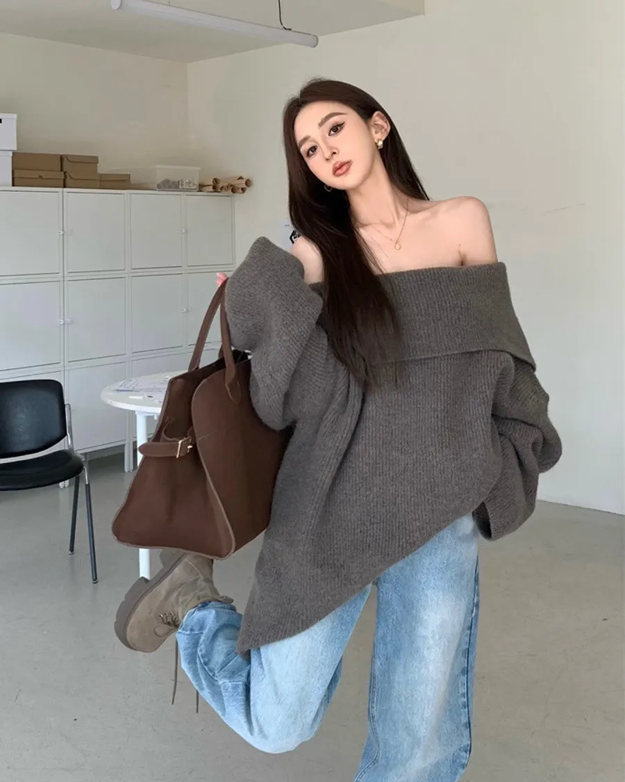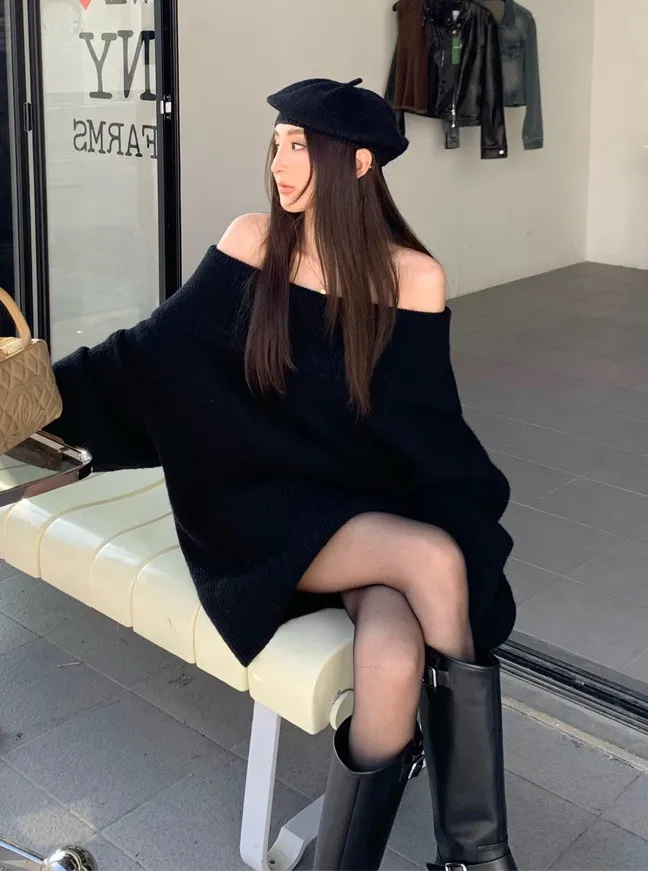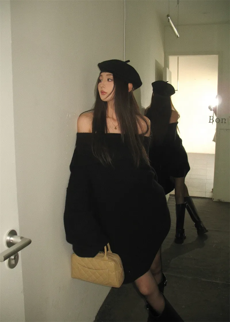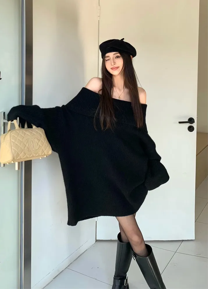 Basic Flat大翻領一字肩平口毛衣洋裝