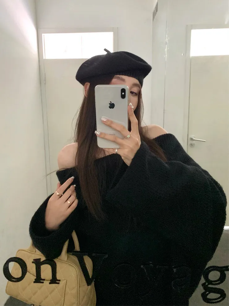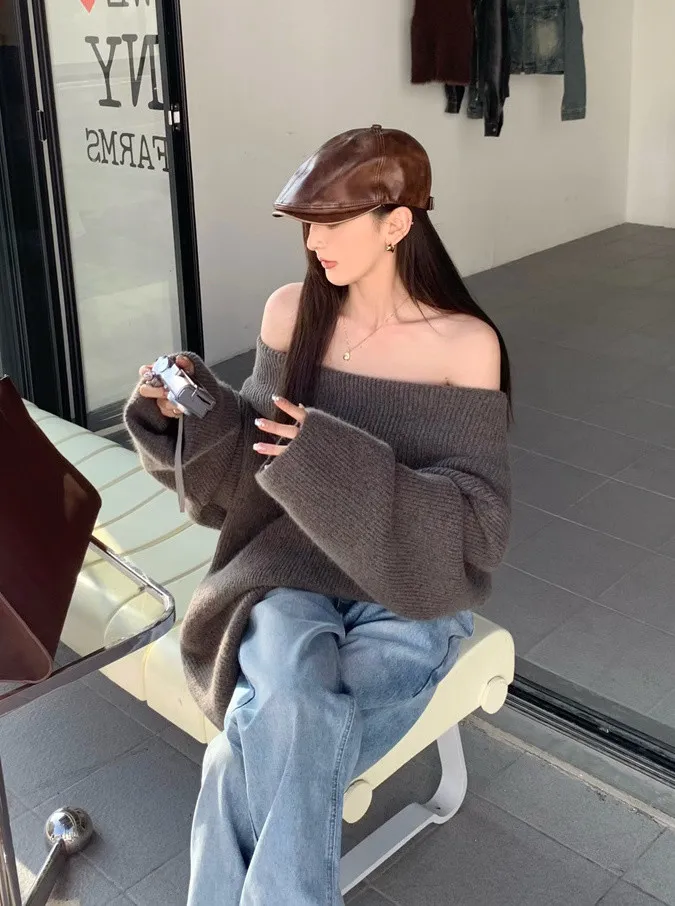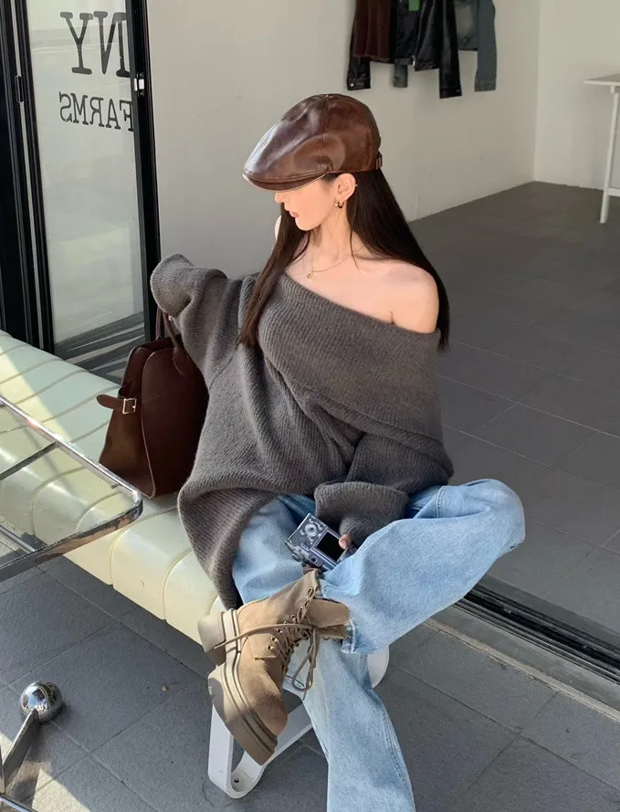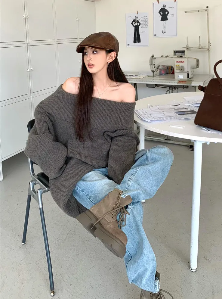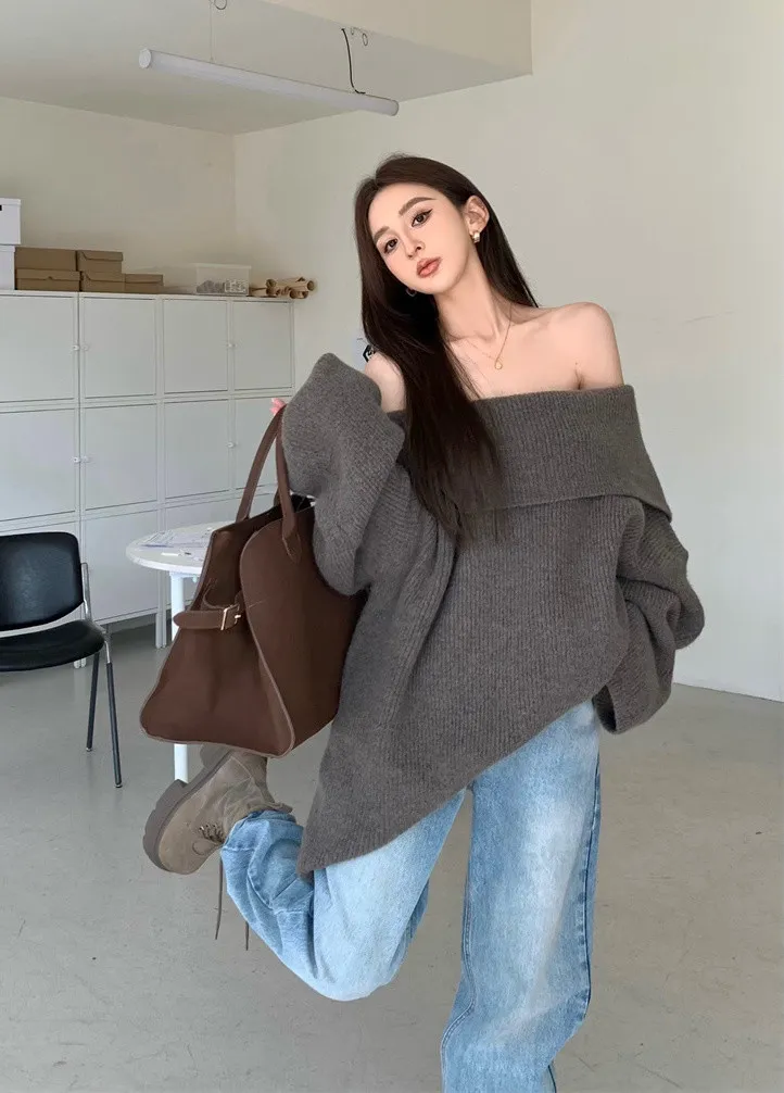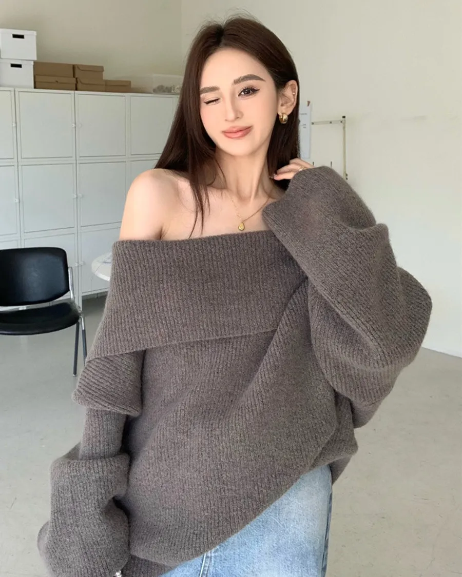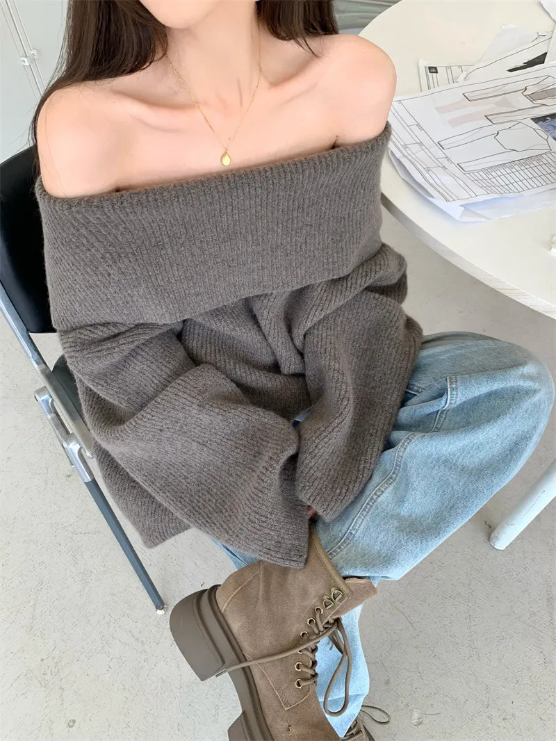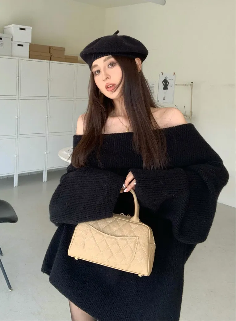 Basic Flat大翻領一字肩平口毛衣洋裝